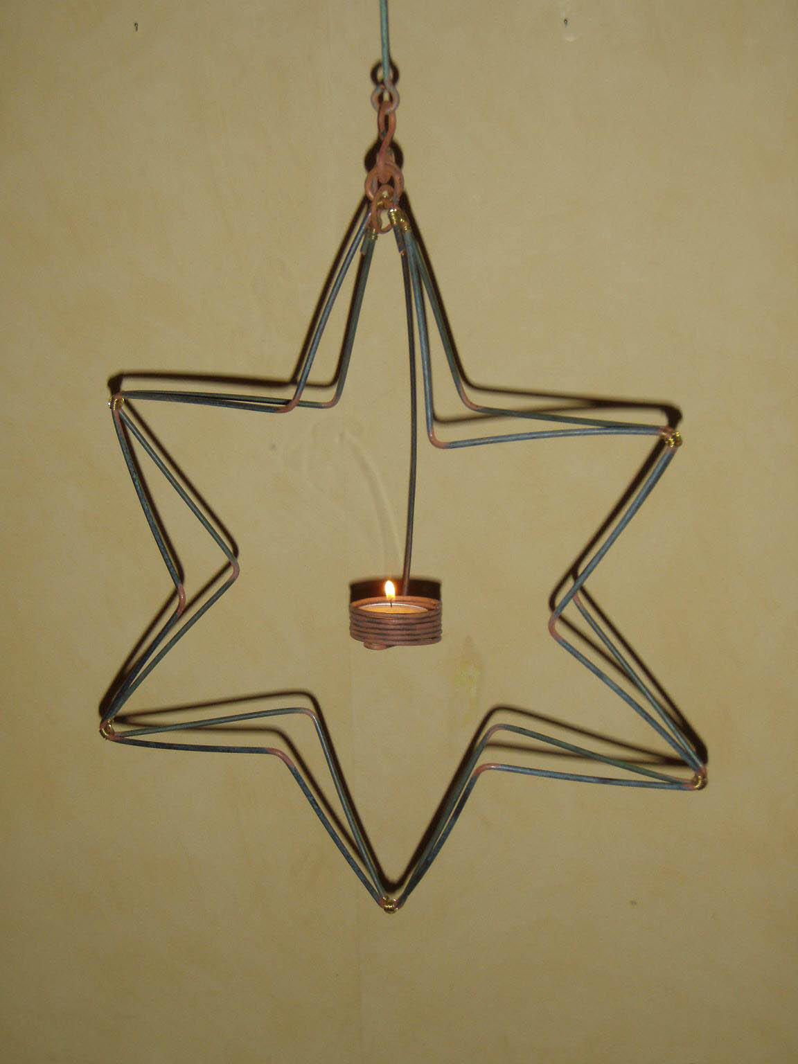 | Sex-uddig stjärna av gammal ärgad el-koppartråd. Sammanfogad med mässingstråd. Hållare för värmeljus. Diameter ca 38 cm. | Pris 475:- Nr 006 |